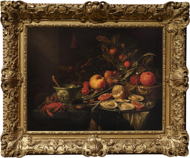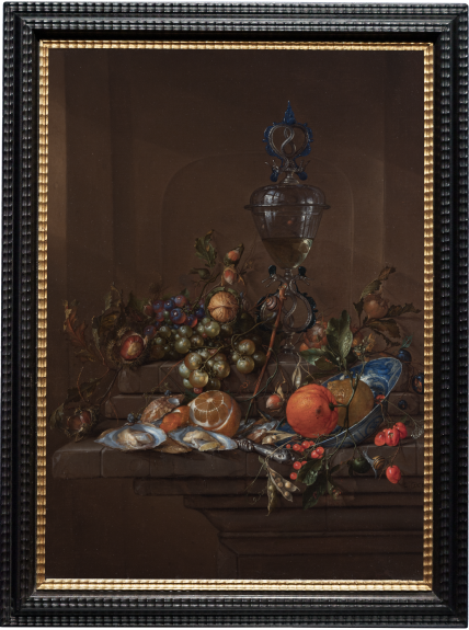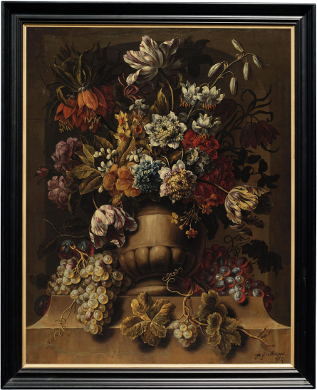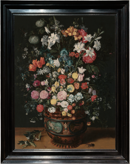 Большой букет из лилий, ирисов, тюльпанов, орхидей и пионов в вазе, декорированной изображениями Амфитриты и Цереры (1640-е)